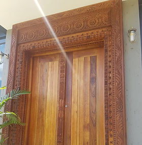 Inspired by ancient Swahili coastal architecture, this Zanzibar Fortress Door features a powerful presence with brass-studded panels and bold geometric carvings on the frame. Traditionally used on palaces and grand homes in Stone Town, this piece is perfect for a secure, dramatic entrance.