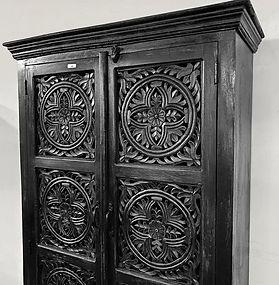 A striking cabinet in dark-stained wood adorned with deep, hand-carved floral medallions. Each door panel showcases concentric circular patterns with botanical motifs, offering both elegance and visual depth. Ideal for classic or vintage interiors, this piece merges storage with sculptural artistry.